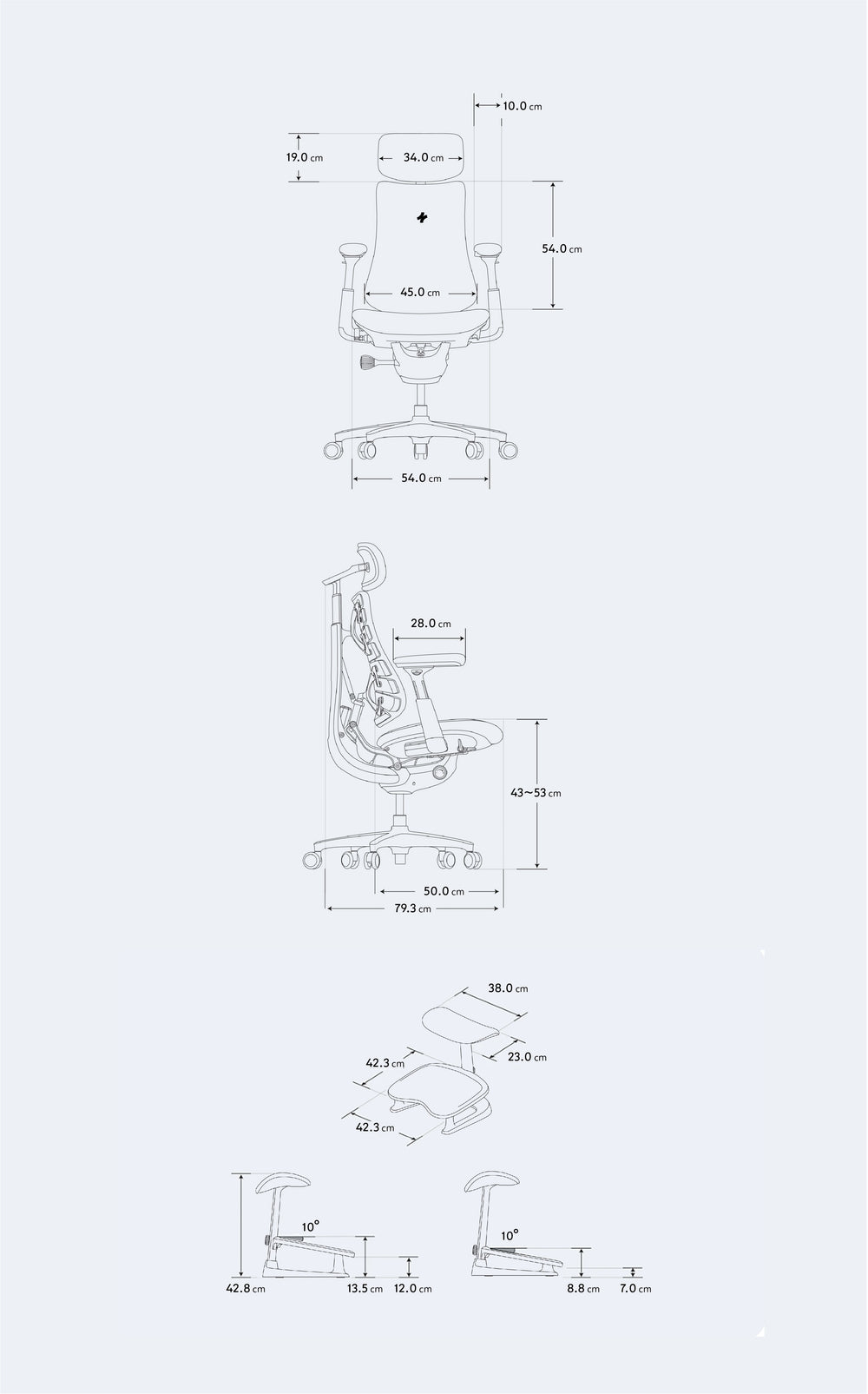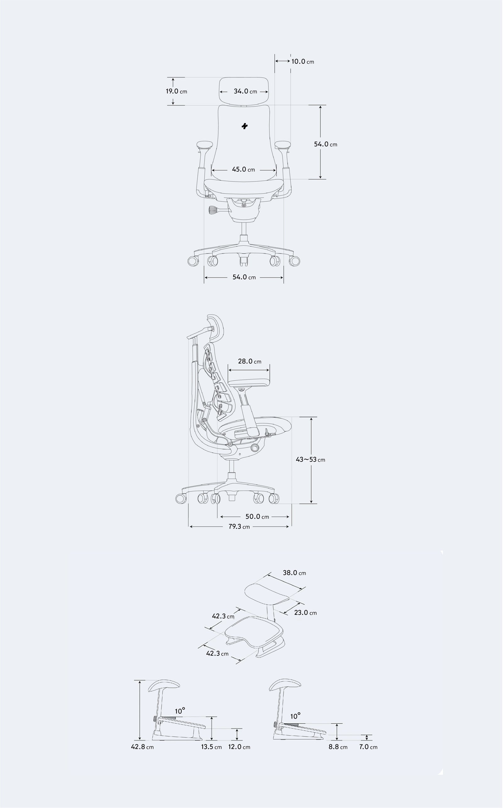 משענות הצוואר והגב נעות בזוויות שונות לשמירה על קו ראייה נוח למסך, בעוד שמשענות הידיים מחליקות לאחור עד 100 מ״מ לתמיכה ארגונומית בעבודה, בגיימינג או במנוחה